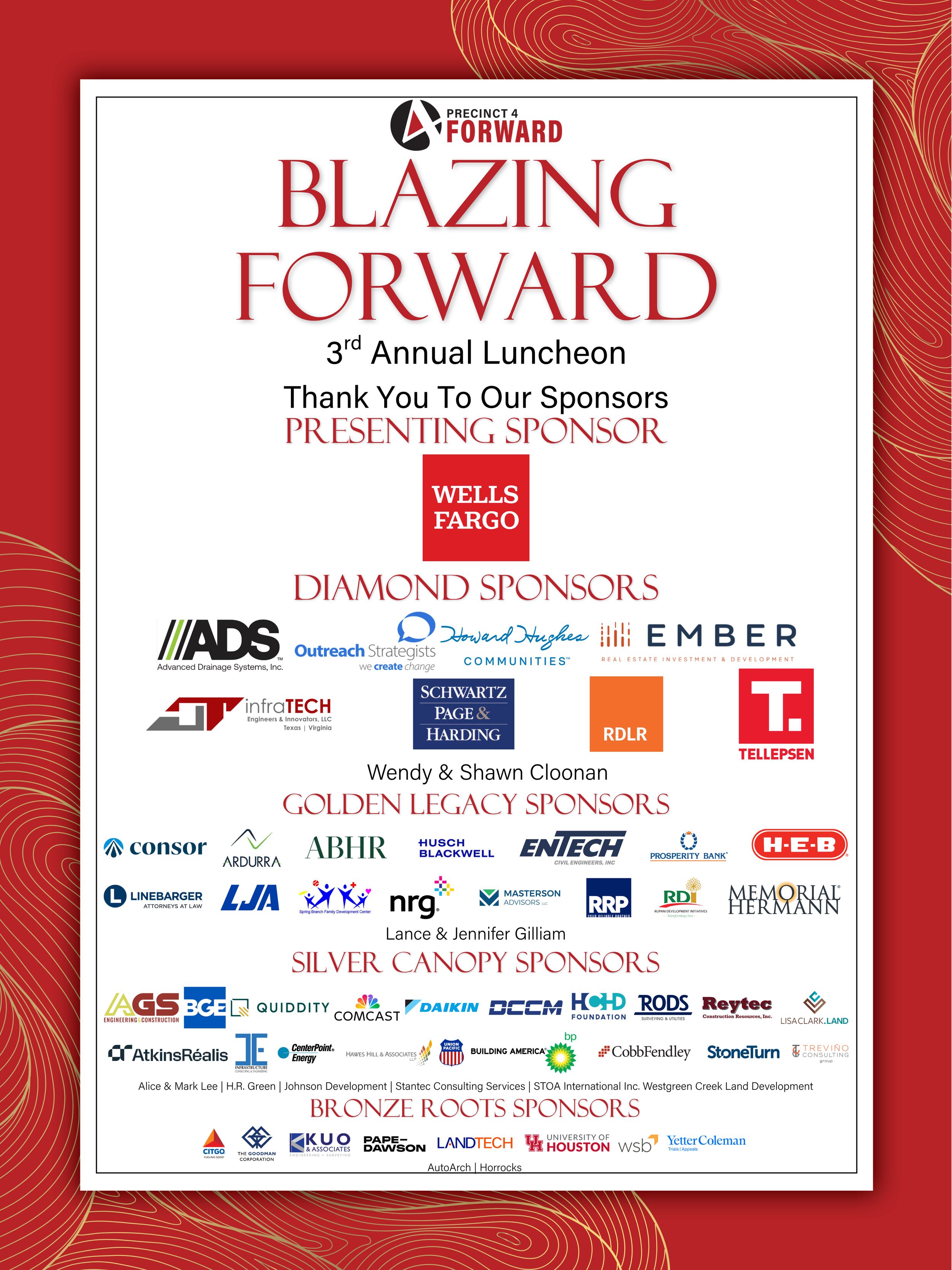 Commissioner Lesley Briones celebrated three years of Precinct4Forward, the nonprofit arm of Harris County Precinct 4, at the annual Blazing Forward Luncheon. Precinct4Forward has launched 14 programs that have served more than 26,000 people in Harris County.